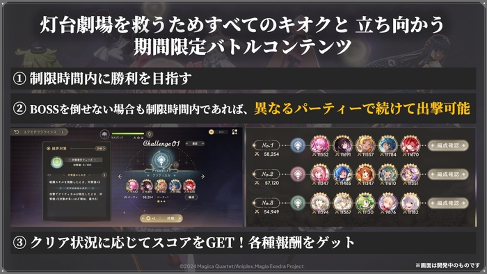 制限時間内に勝利を目指すバトルコンテンツとなっており、BOSSを倒せない場合も制限時間内であれば異なる編成で続けて出撃可能です。 クリア状況に応じてスコアをGETすることができ、各種報酬を獲得いただけます。